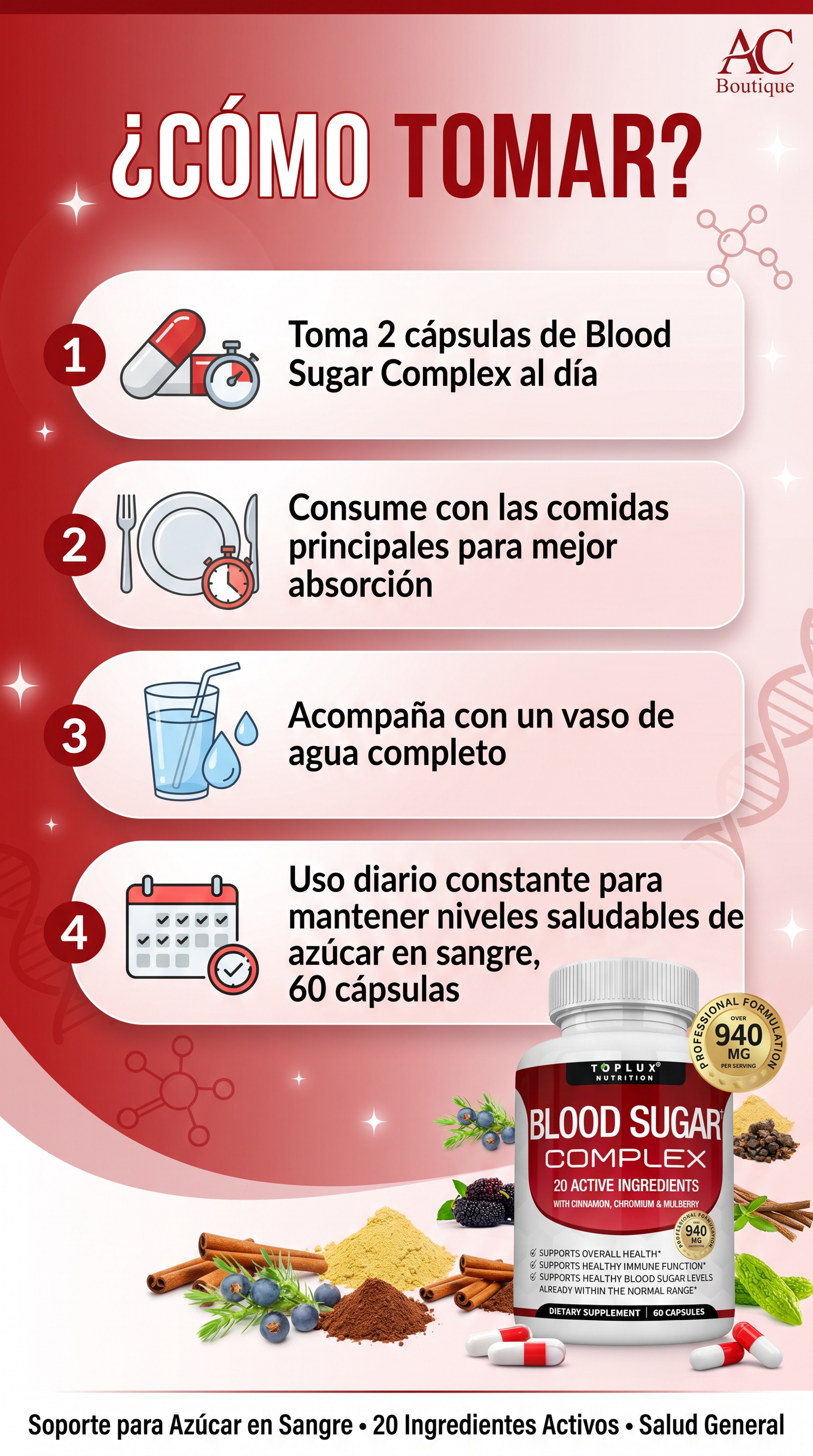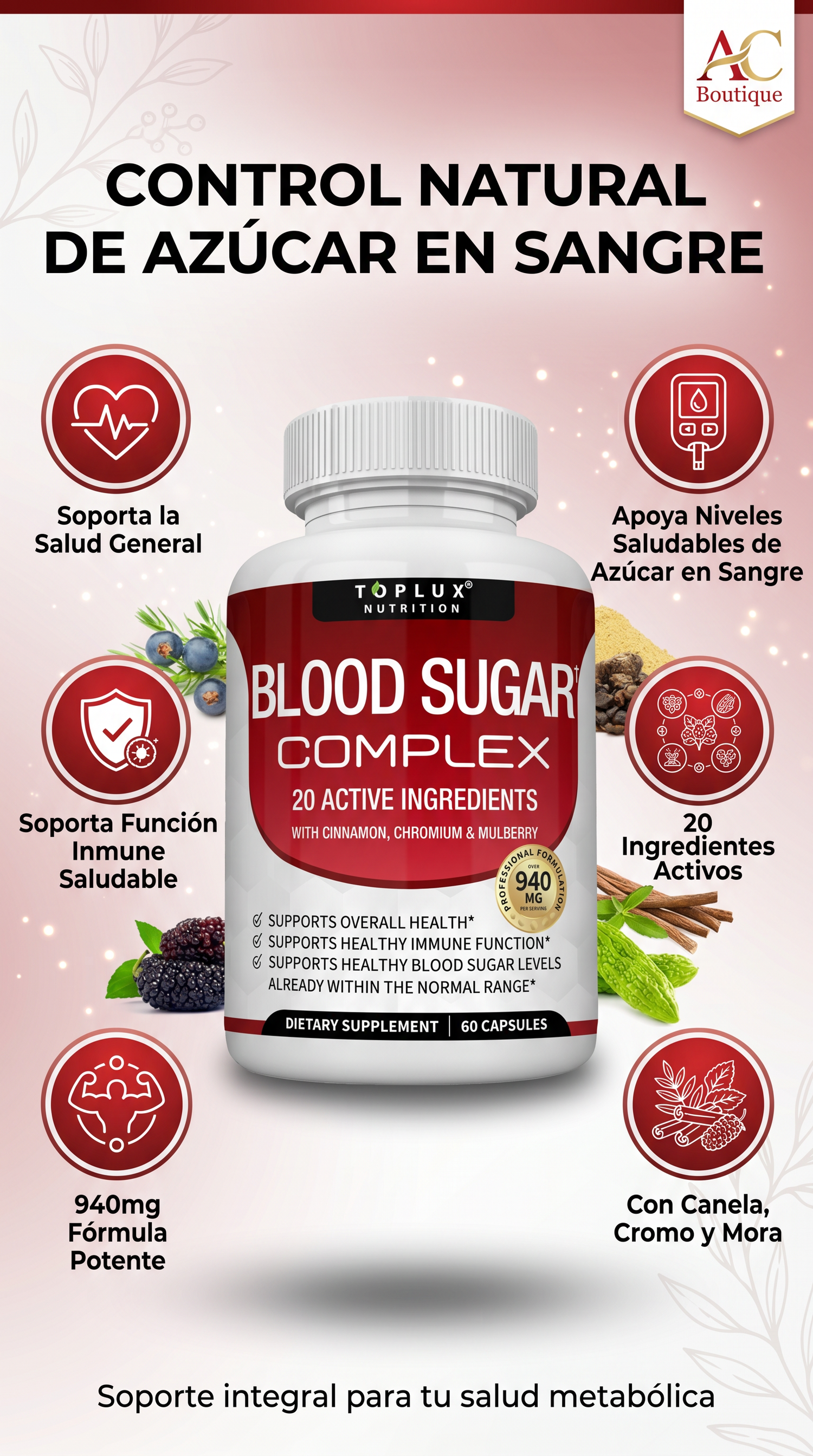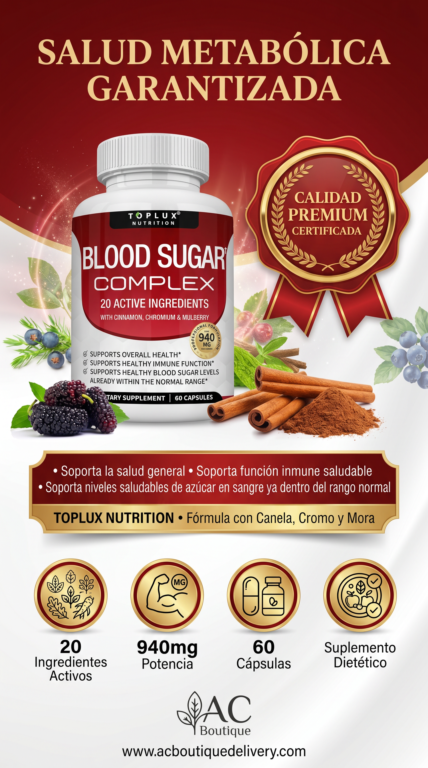 Tu cuerpo necesita el combustible adecuado para funcionar sin altibajos. Blood Sugar Complex de Toplux Nutrition no es solo un suplemento, es tu aliado diario. Diseñado con una fórmula profesional de 940mg y 20 ingredientes activos, está pensado para apoyar tu salud integral de la forma más natural posible.