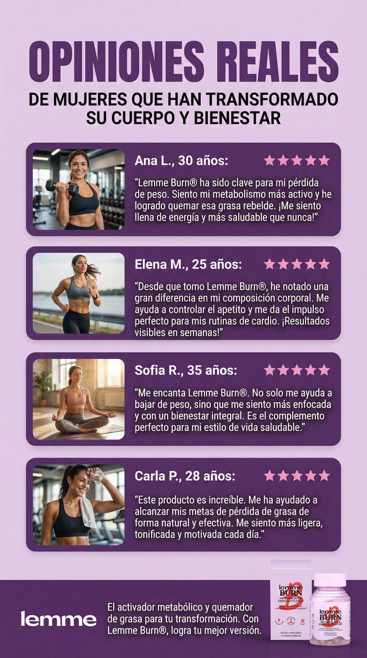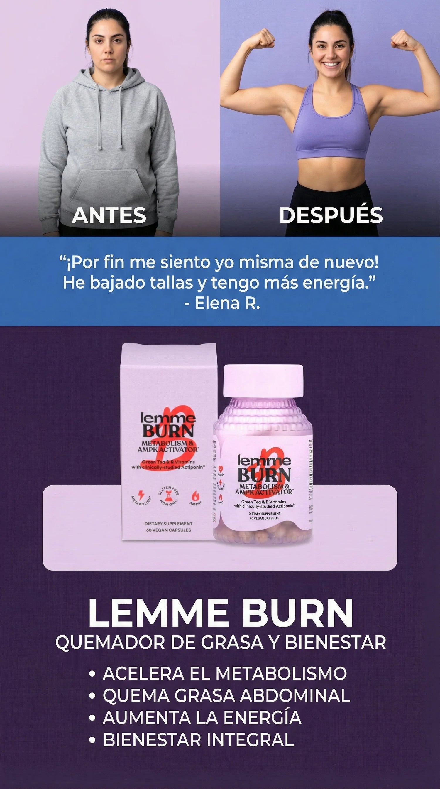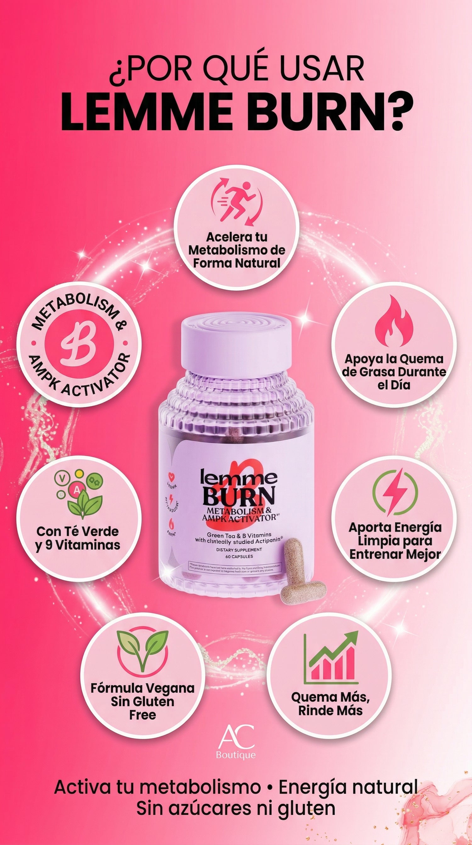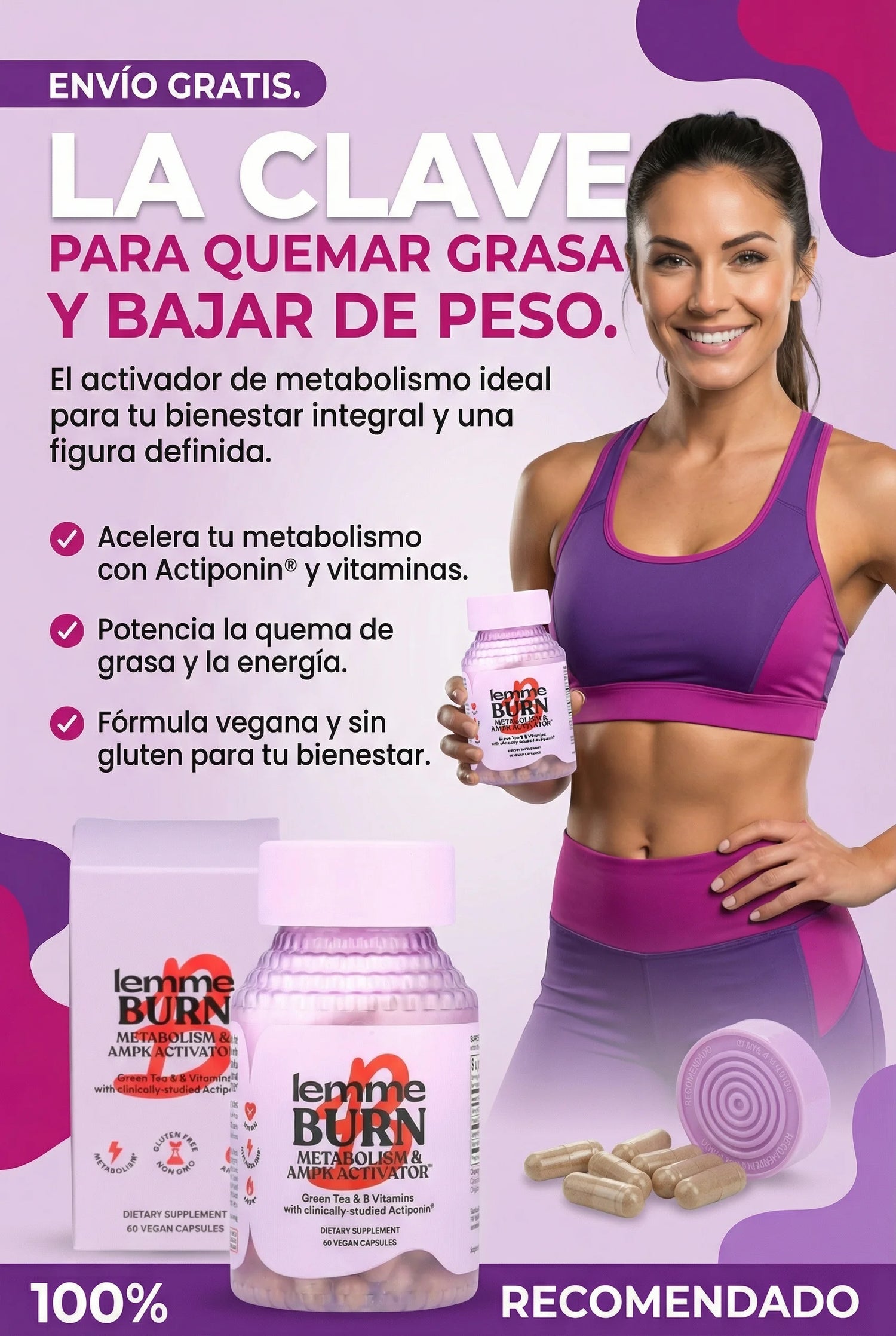 QUEMA MÁS, RINDE MÁS: Despierta tu Metabolismo de Forma Natural. Lemme Burn es el activador metabólico y de AMPK formulado con ingredientes clínicamente probados para potenciar la quema de grasa y darte energía limpia durante todo el día.